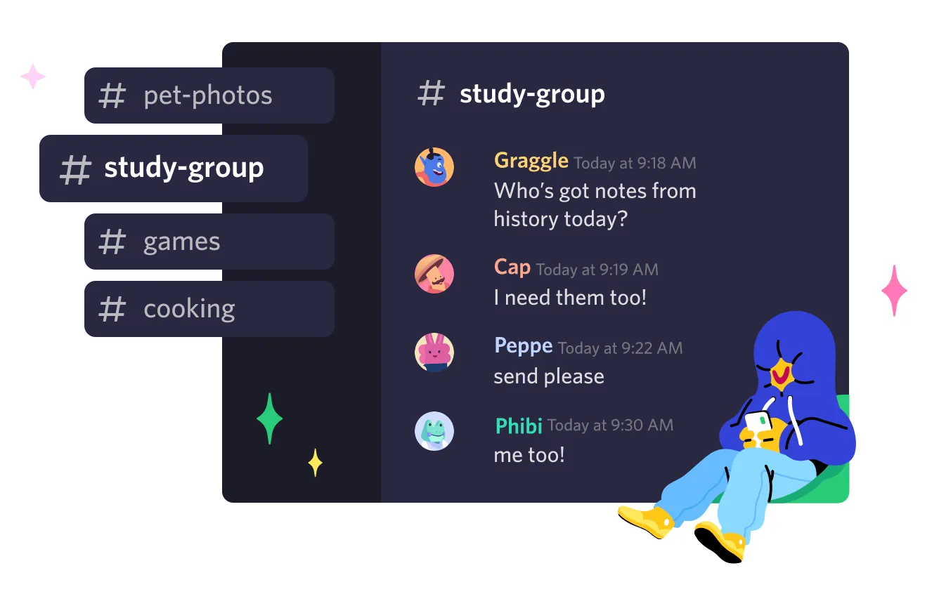 - ボイスチャット:ボイスチャンネルを作成して,複数人での音声通話を楽しむことができます.ノイズ除去機能や通話するグループを簡単に分けることができることなどから,品質の高い通話が可能です.
