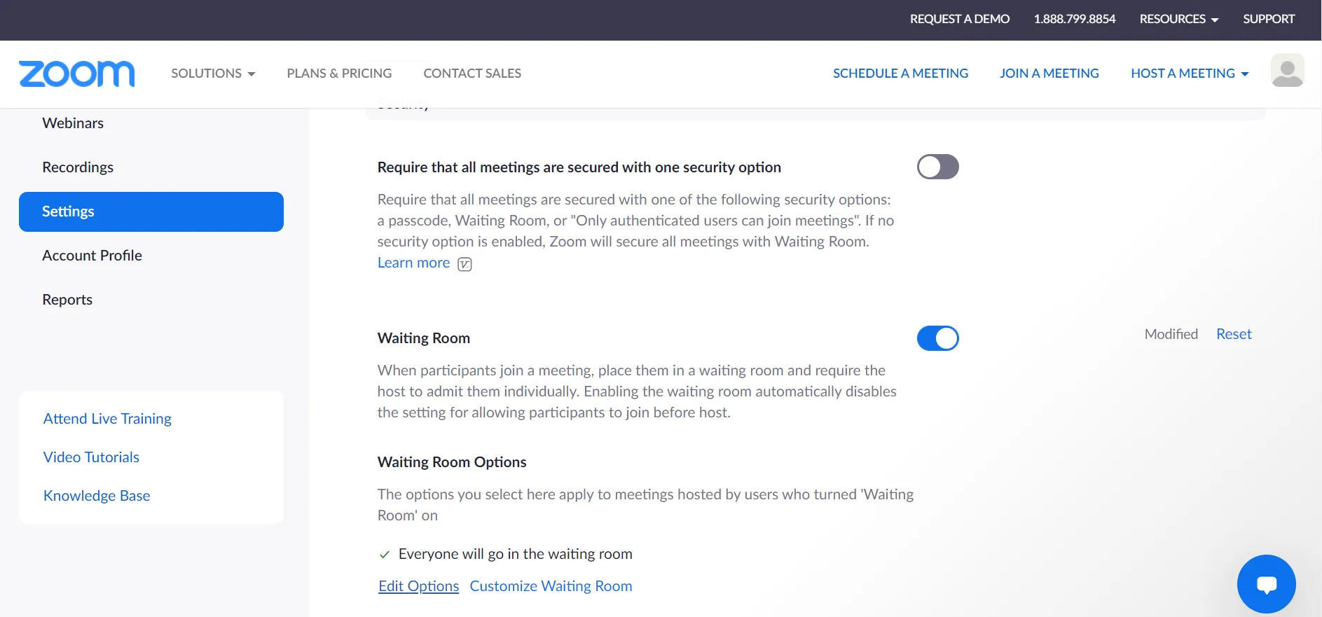 - (1) ”Waiting Room” & (2) ”Require authentication to join”: These fields can be found under the “Security” section in the “Schedule a Meeting” page. Please also refer to the “Scheduling a Zoom Meeting (Web Portal)” page for procedures to schedule a meeting.