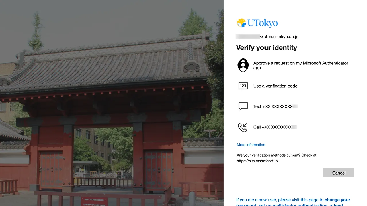 UTokyo Account has adopted the use of Multi-Factor Authentication (MFA). If you set up Multi-Factor Authentication, you will be asked to confirm your identity via SMS or an authentication application in addition to your password, when signing in to your account. For more information, please refer to the Using Multi-Factor Authentication for UTokyo Accounts page.