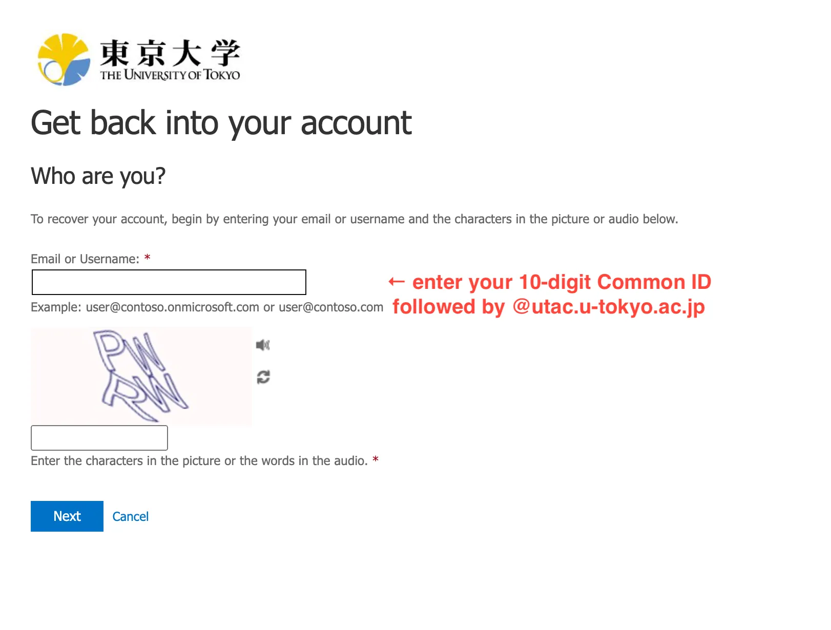 @utac.u-tokyo.ac.jp” in the “Email or Username” field, and the text in the image below it, then press “Next”.