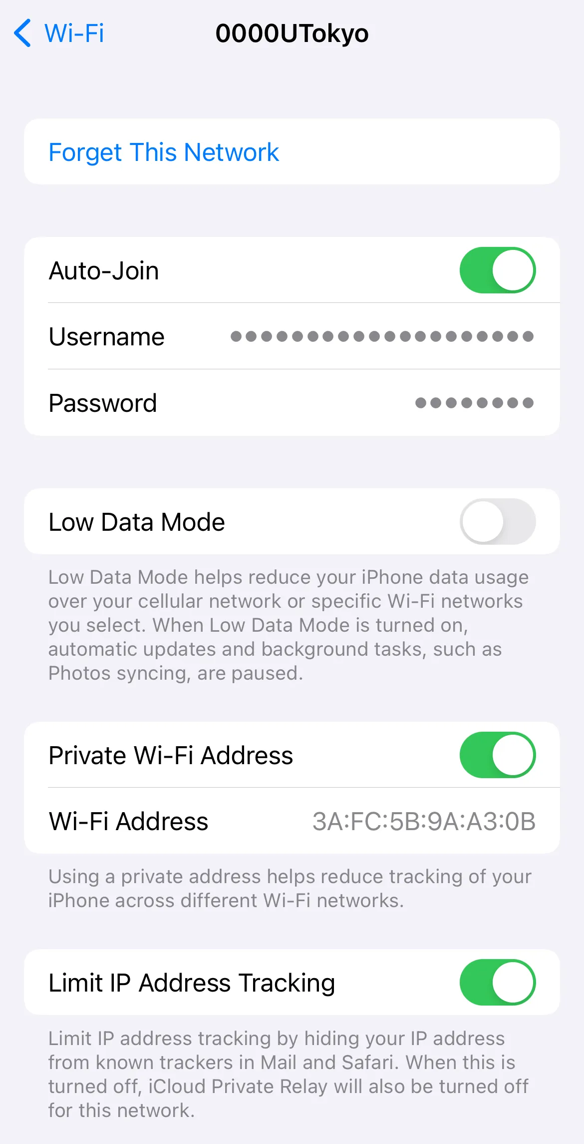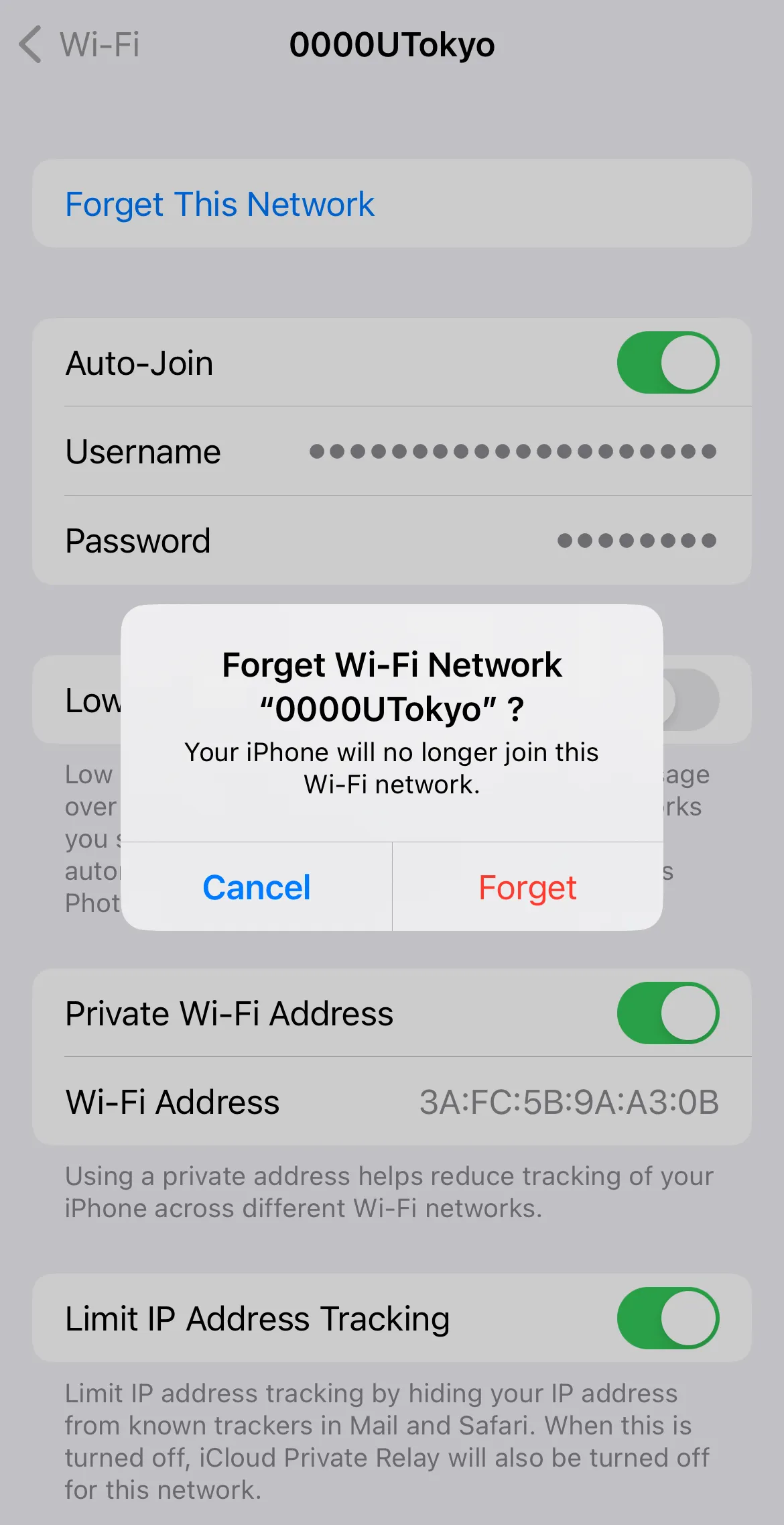 Tap the SSID found in Step 2, select “Forget this Network”. When the screen saying “Forget Wi-Fi network “0000UTokyo”?” comes up, select “Forget”.