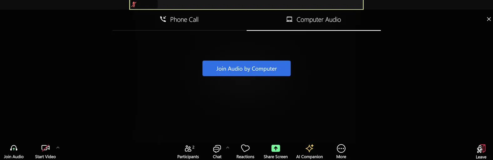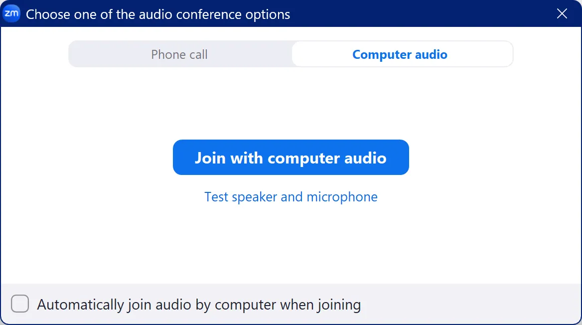 - If the “Join Audio by Computer” screen appears when joining the meeting, click “Join Audio by Computer”. You can then join Zoom with the audio settings configured in step 2.