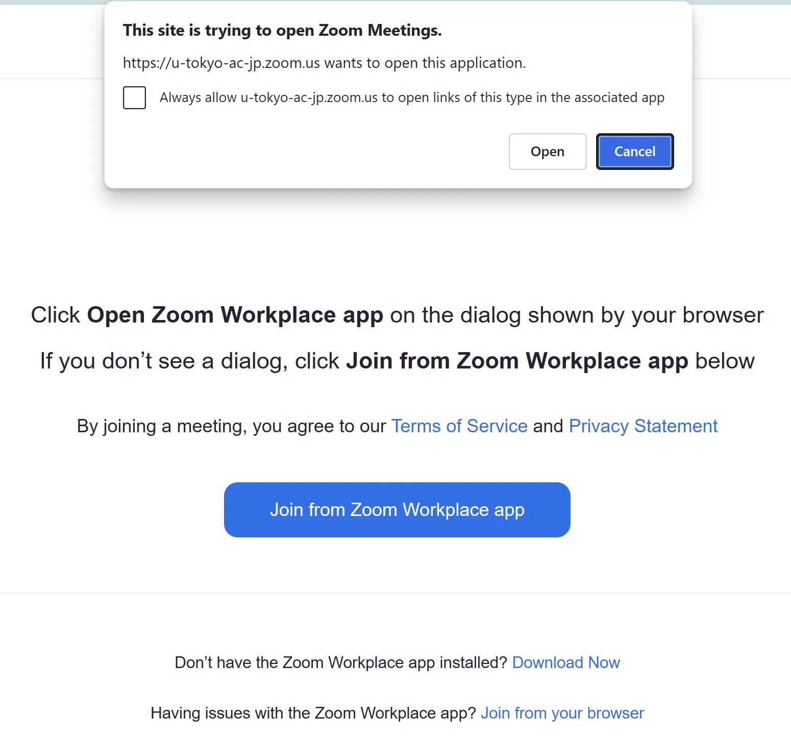 - Open the invitation URL in your browser. For example, a Zoom meeting URL created with a UTokyo account typically looks like