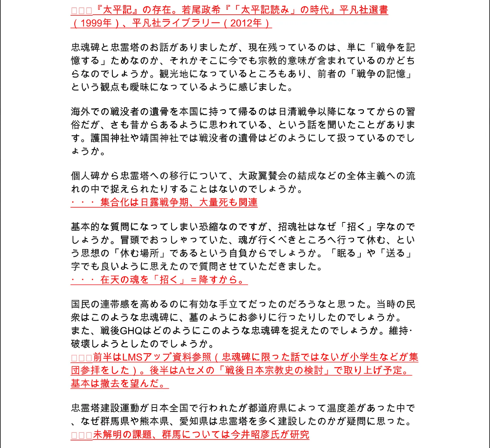 リアクションペーパーを通して寄せられた質問は、毎週 30 ~ 40 個ほどありました。一覧表を見ながら、質問を 10 問程度ピックアップし、翌週のリアルタイム授業の中で回答しました。時間的な制約もあるので、学生にはあらかじめピックアップした質問にだけ答えると伝えておきました。 リアルタイム授業の目的の一つは、学生同士で質問内容の共有を行うことでした。ですので、学生にはピックアップした質問の内容を紹介するようにしました。具体的には、PDF ファイルに質問をまとめ、あらかじめ学生に配布しました。リアルタイム授業では、教員の手元にある Word ファイルを画面共有して解説しました。余力がある時は、資料に簡単な回答や参考文献も加えましたが、余力が無い時は授業中に、Word ファイルに直接解説を書き込み、口頭で解説をしました。画面共有を板書のように使いました。