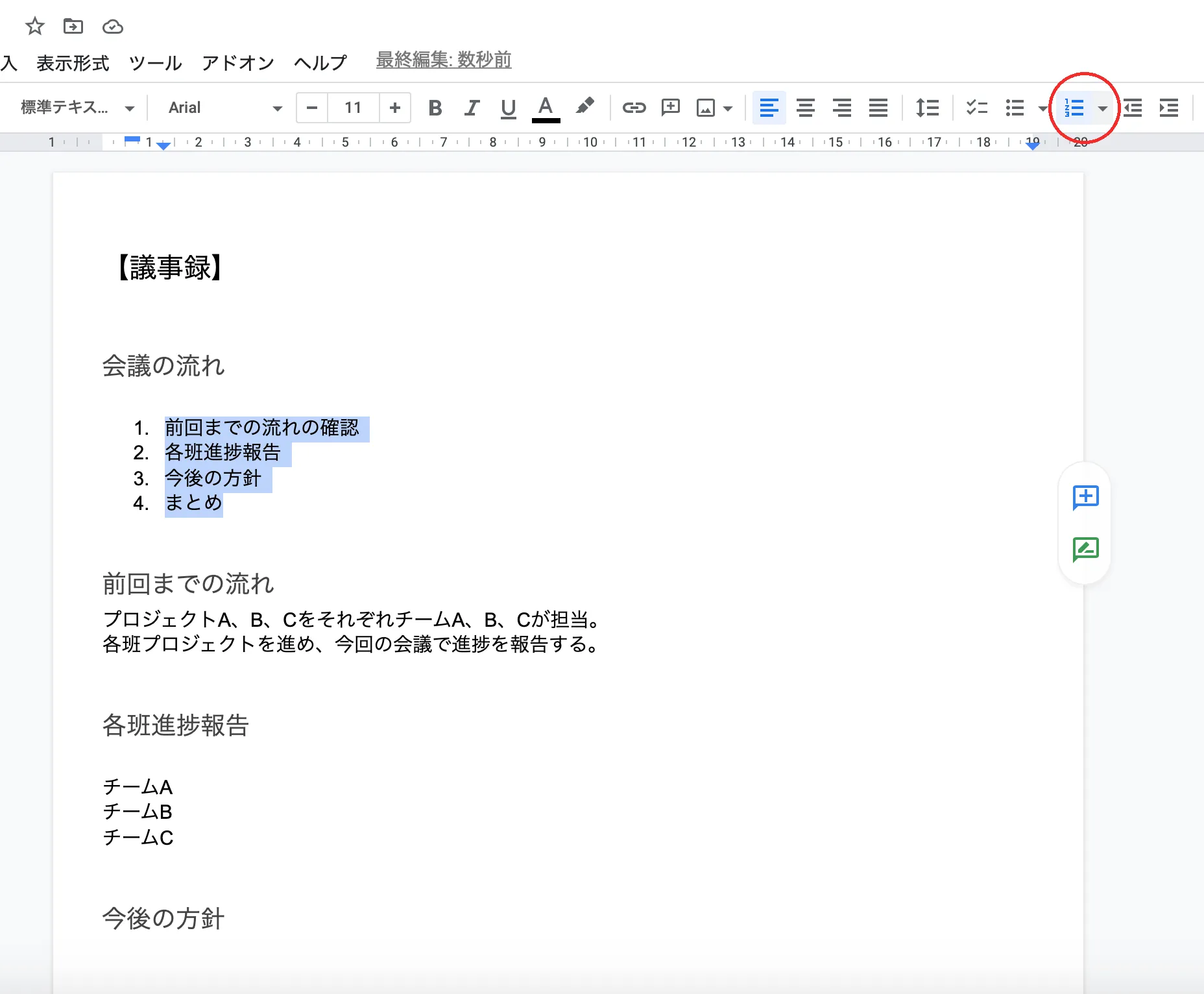 上の例では,「【議事録】」を「見出し2」に,「会議の流れ」「前回までの流れ」「各班進捗報告」「今後の方針」「まとめ」をそれぞれ「見出し3」に設定しました.