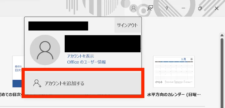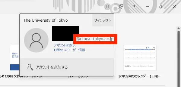 - 上記のような画面が表示されず,通常の編集画面が表示された場合:OfficeアプリになんらかのMicrosoftアカウントでサインインしている状態です.右上の人型のアイコンをクリックした後,現在サインインしているアカウントを確認してください.UTokyo Accountでない別のアカウントでサインインしていた場合は「アカウントを追加する」を選択してください.