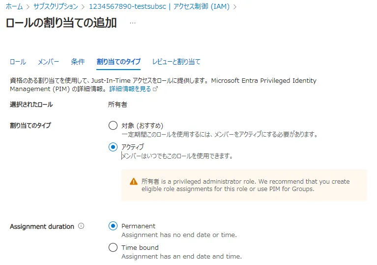 特権管理者ロールである所有者,UAA,RBACを除くすべてのロールを割り当てることをユーザーに許可しますを選択してください. - サブスクリプションを相手に引き継ぐ場合のみ