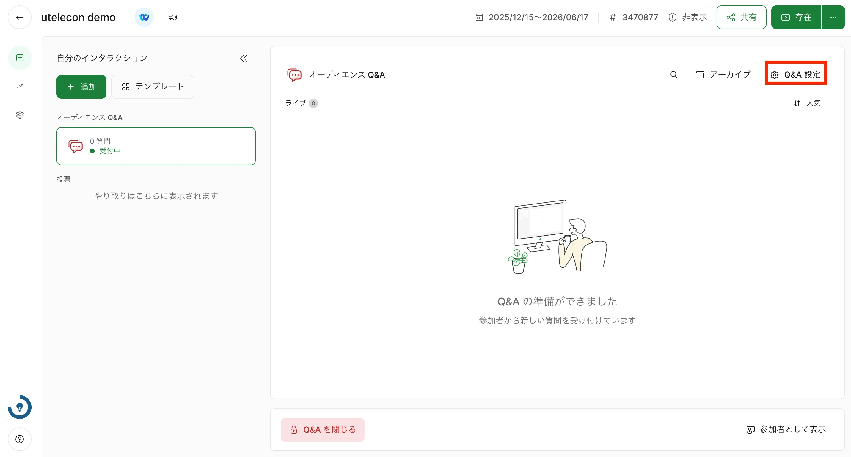 Q&Aを作成するには,画面左上または「新しいインタラクションを追加」内の「オーディエンス Q&A」を選択してください.