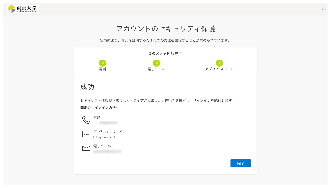 以上で多要素認証の初期設定手順は完了ですが,設定がシステム全体に反映されるまで最大約30分かかります.多要素認証の設定が完了していないとサインインできないようなシステムを利用したい場合は,それまでしばらくお待ちください.