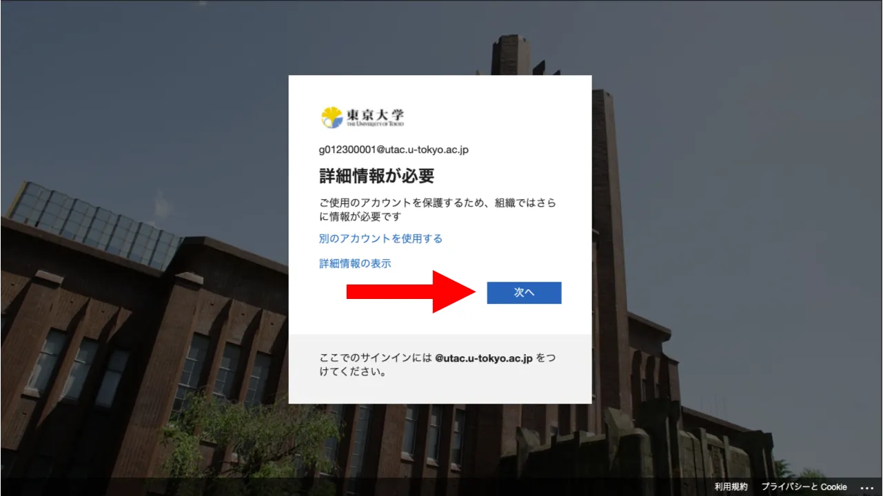 @utac.u-tokyo.ac.jp)とパスワードを入力してください. - 「詳細情報が必要」という画面が表示されるので,「次へ」を押してください.
