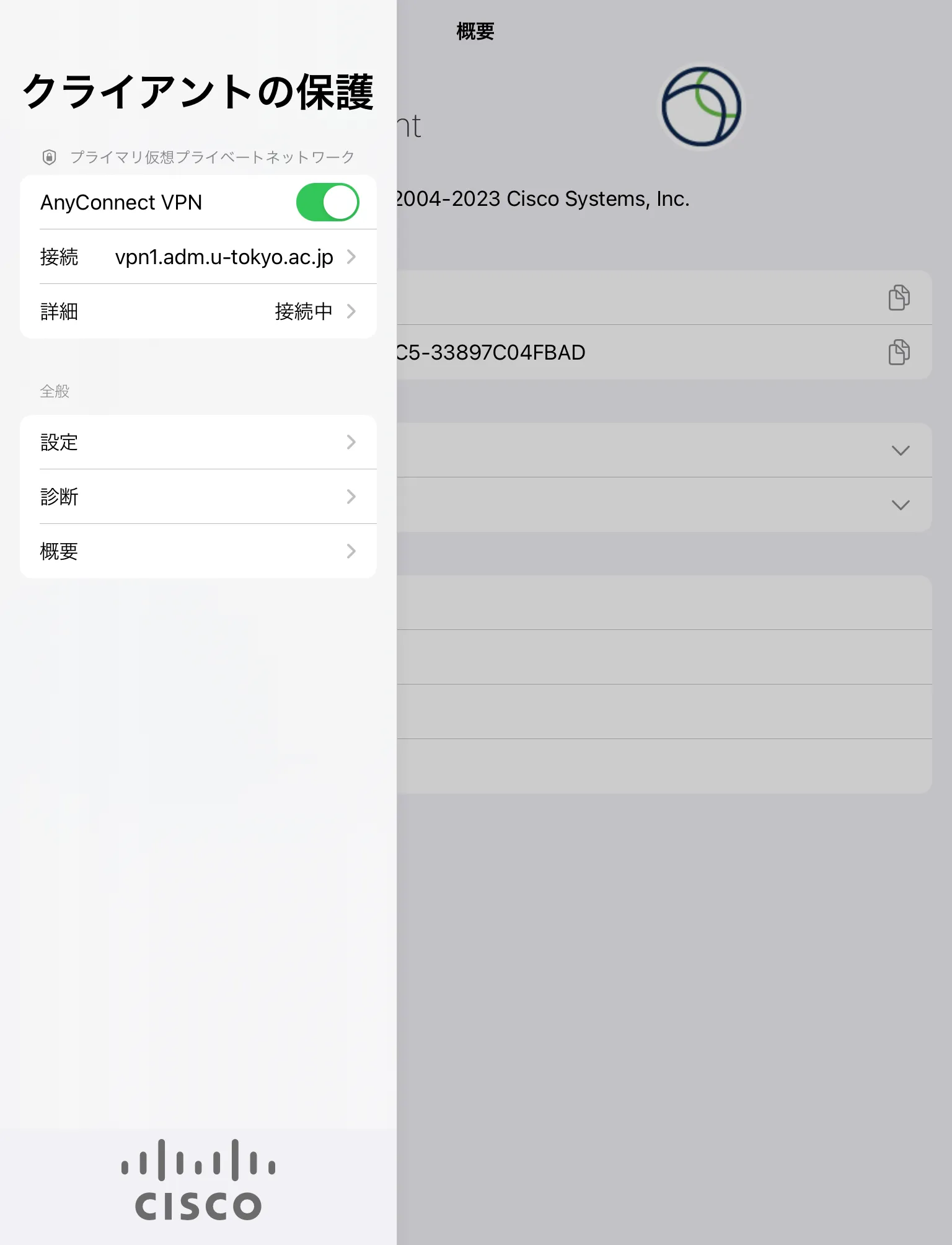手順H: 以下の画面のように「詳細」が「接続中」と表示されていれば,お使いの機器はUTokyo VPNに接続している状態です.