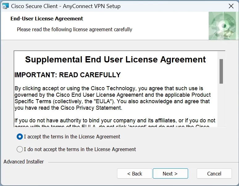 手順A・手順Bにおいて使用するブラウザを,Google ChromeまたはMicrosoft Edgeに変更することで,問題が解消する可能性があります.手順D: インストールが完了すると,アプリにVPNクライアントアプリケーションであるCisco Secure Clientが追加されています.