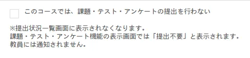 コース全体を提出不要にするには,コーストップ上部の「このコースでは、課題・テスト・アンケートの提出を行わない」にチェックを入れてください.