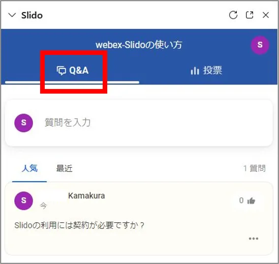 「Q&A」を押すと,主催者・プレゼンター(・パネリスト:Webex Webinarsのみ)に質問を送ることができます.