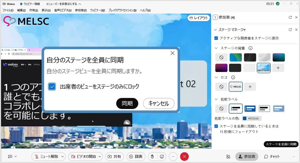 - 「同期」を選択し,ステージのレイアウトを出席者に同期します.