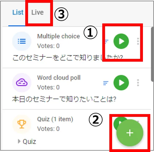 - 投票結果は③Liveタブで確認できます.