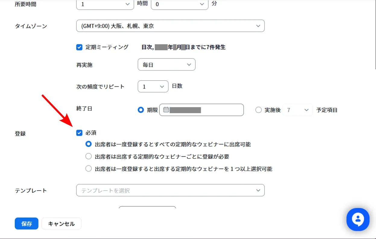 - 「ミーティング日の後に登録を閉じる」チェックボックスをオンにしてください.