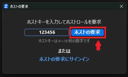 ホストは,あらかじめ他のユーザーに「ホストキー」とよばれるコードを共有しておくことで,ミーティング開始時に自身が不在の場合であっても,代わりに他のユーザーにホストを務めてもらうことができます.この機能は,ホストがミーティングに遅れて参加する場合3で,他のユーザーに一時的にホストを担ってもらいたい場合などに利用します.この場合,元々のホストがミーティングに参加すると「共同ホスト」に割り当てられますが,「ホストの再要求」を行うことでホストに復帰することが可能です.