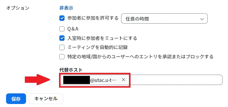 - 「代替ホスト」欄に,追加対象のユーザーのUTokyo Account(数字10桁の共通ID +