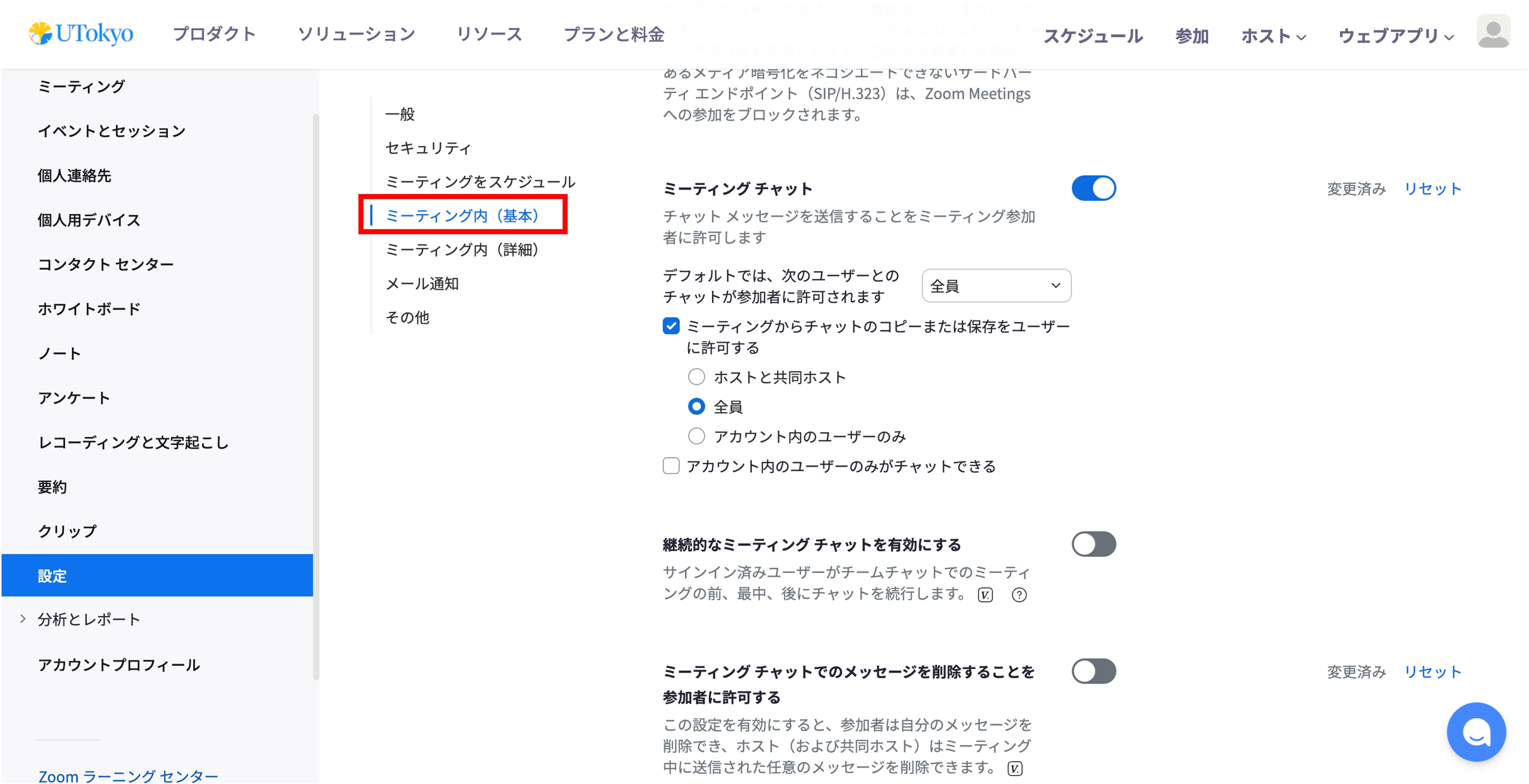 チャットに関する機能の有効化は,ほとんどがウェブポータルの「ミーティング内(基本)」という項目から設定できます.ここでは,「ミーティング内(基本)」から設定できるチャット関連の機能の基本的な設定手順と,使用手順について説明します.